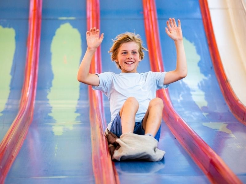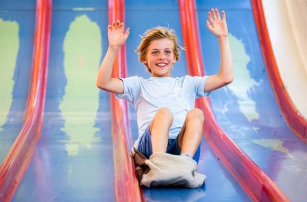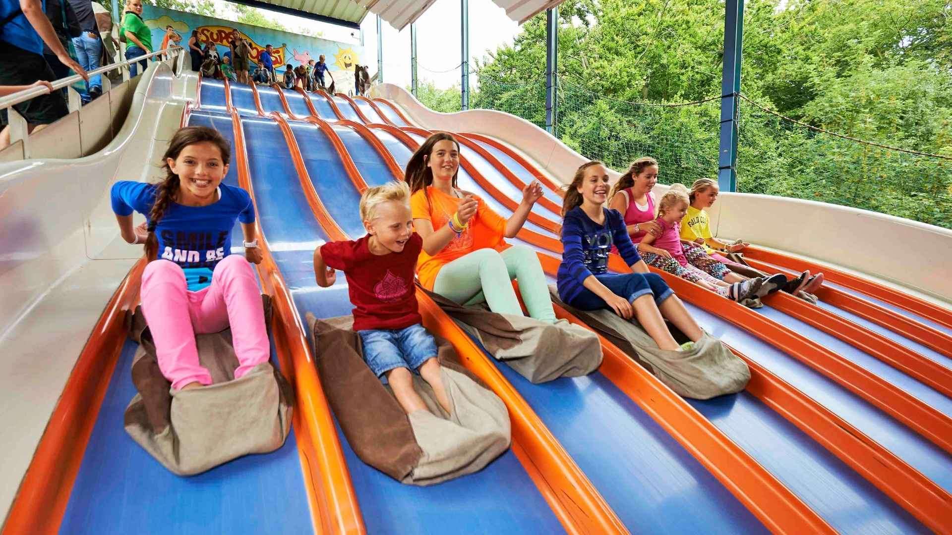 Auf die Plätze, fertig…? Los! Die Superrutsche hat acht Rutschbahnen nebeneinander. Lauf hinauf und rutsch dann auf einem Sack von dieser Superrutsche herunter! Wer ist als erster unten angekommen?