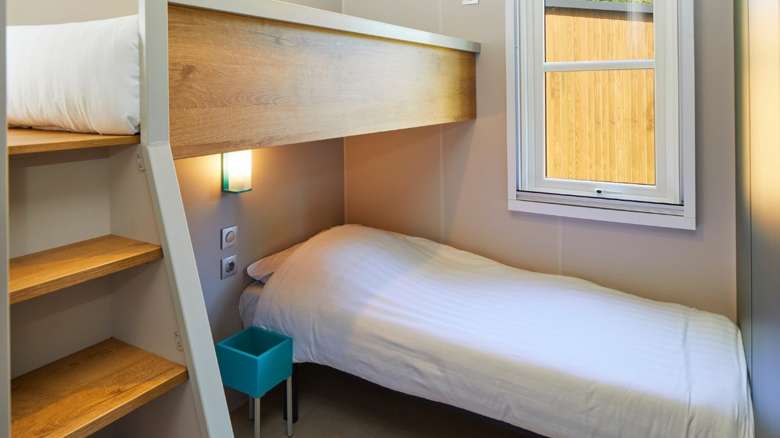 Der Duingalow bietet Platz für sechs Personen und verfügt über drei Schlafzimmer: ein Schlafzimmer mit Doppelbett, ein Schlafzimmer mit zwei separaten Einzelbetten und ein Kinder-Schlafzimmer mit Hochbett und einem separaten Einzelbett.