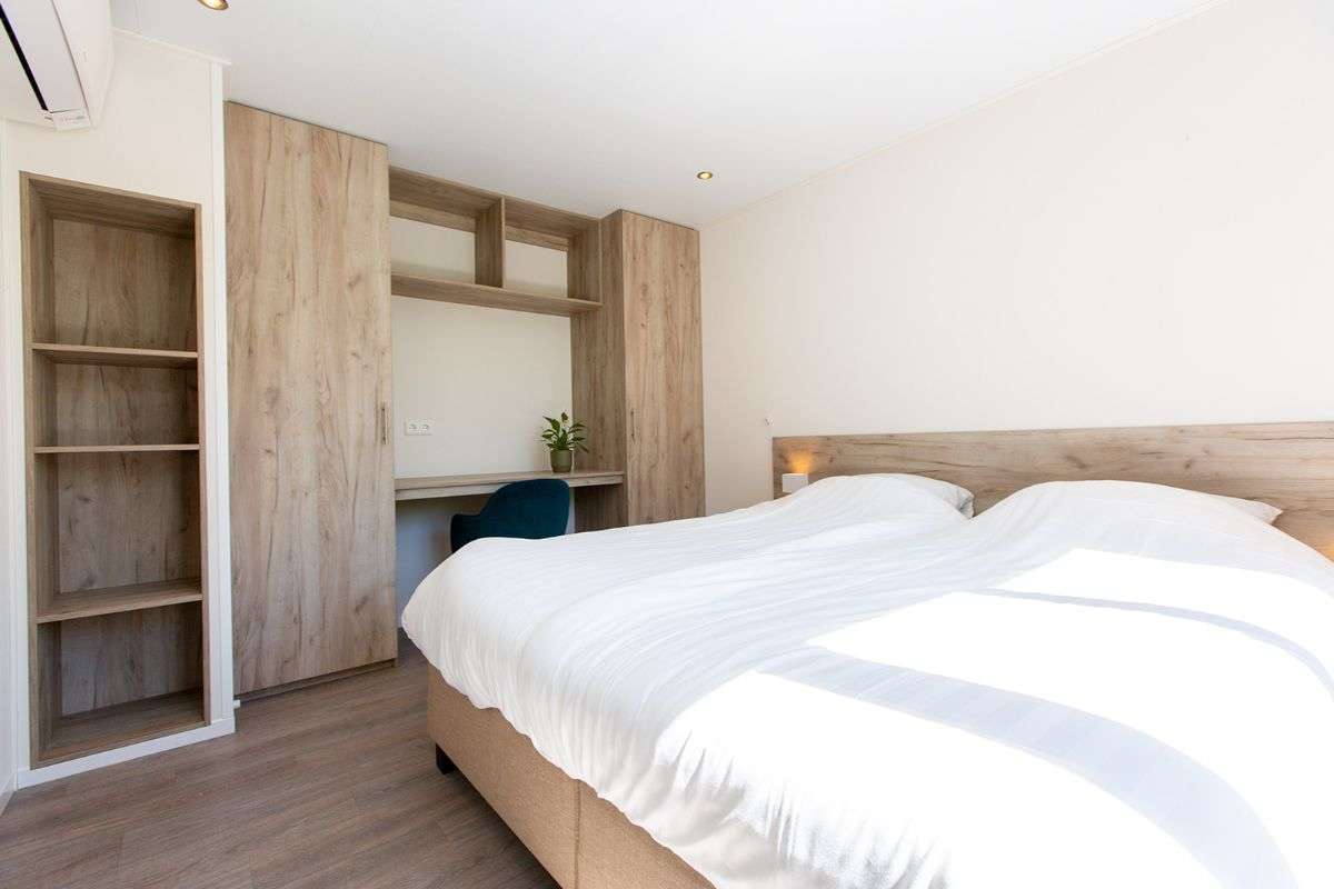Im Erdgeschoss befinden sich außerdem eine separate Toilette, das Badezimmer mit geräumiger begehbarer Dusche und das Hauptschlafzimmer. Dieses Schlafzimmer für zwei Personen verfügt über ein luxuriöses Boxspringbett, eine Klimaanlage, einen geräumigen Kleiderschrank, einen Schreibtisch und einen Fernseher.