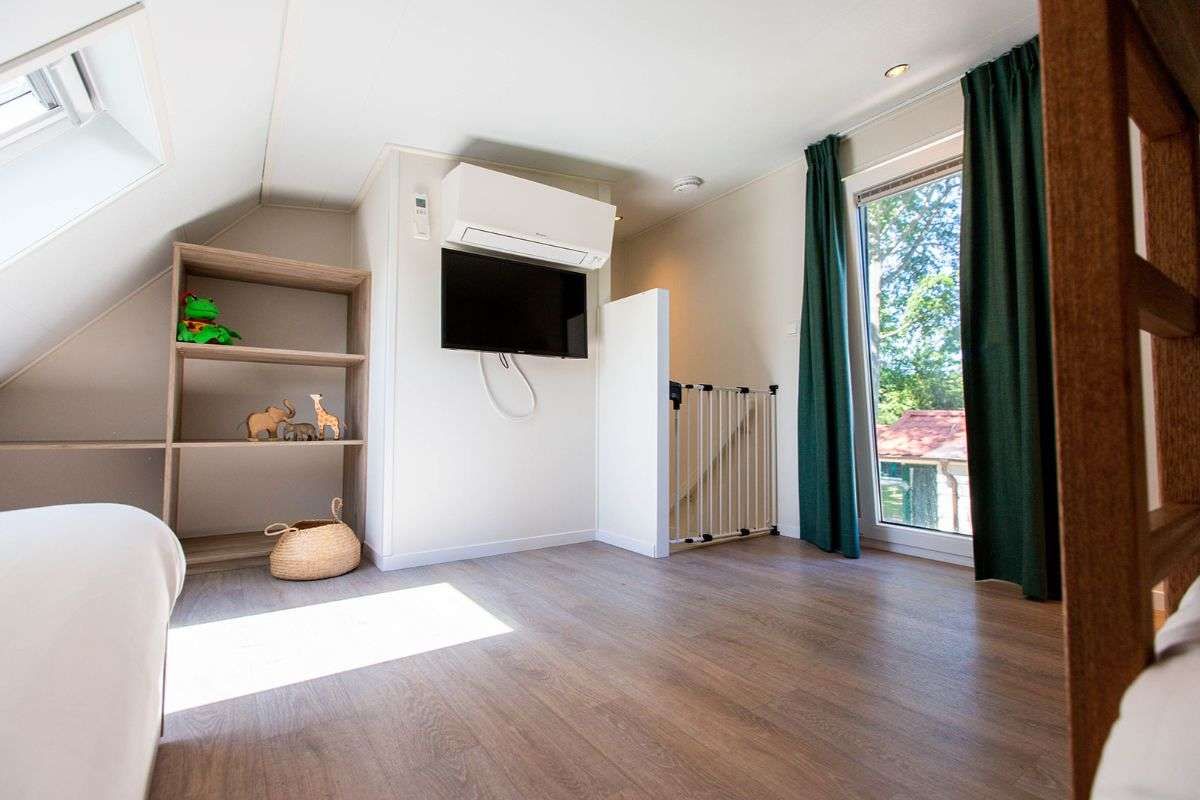 Die Treppe führt zum Schlafboden mit Platz für drei Kinder. Hier finden Sie ein Etagenbett und ein Einzelbett, einen Fernseher, eine Klimaanlage und einen Kleiderschrank.