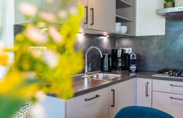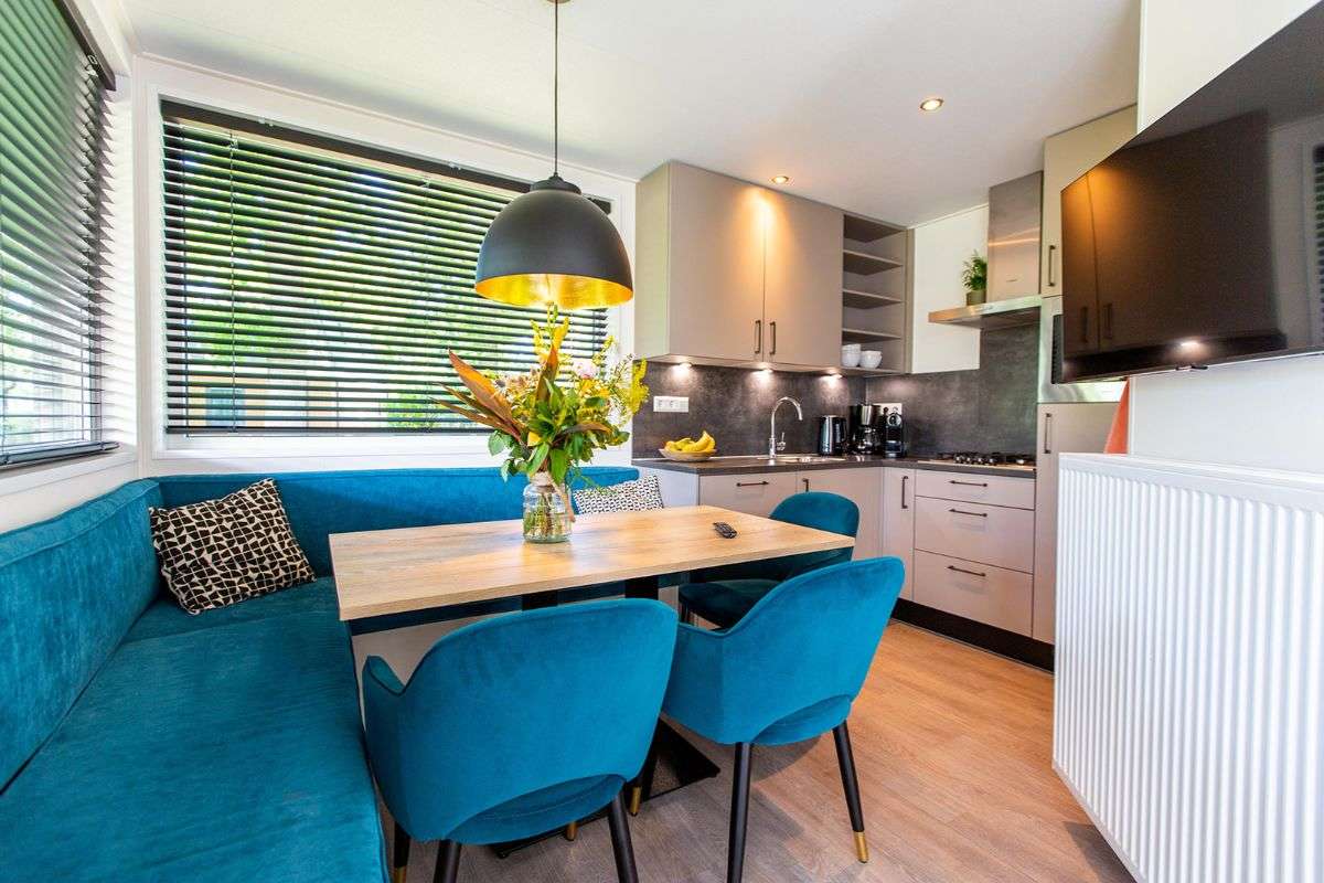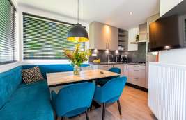 Dieses luxuriöse und kompakte Duingalow bietet Platz für 2 Erwachsene und 3 Kinder. Das Erdgeschoss besteht aus einer gemütlichen Wohnküche mit einer schick eingerichteten Sitzecke. Die Küche ist luxuriös ausgestattet mit Geschirrspüler, Nespresso-Kaffeemaschine, Wasserkocher, Gasherd, Kombimikrowelle und Kühlschrank mit Gefrierfach.