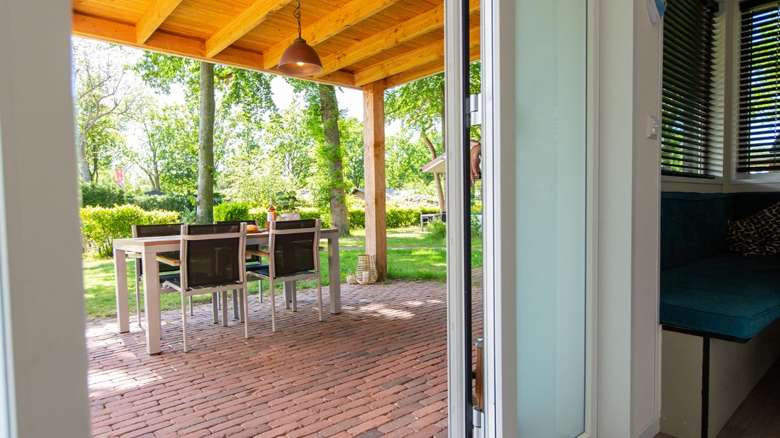 Die überdachte Terrasse im Außenbereich ist komfortabel mit einem Lounge-Set, einem Esstisch mit Stühlen und zwei Liegestühlen ausgestattet.