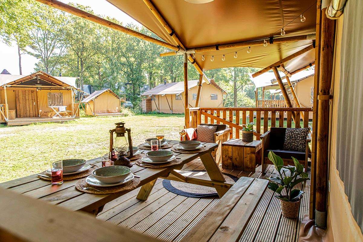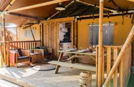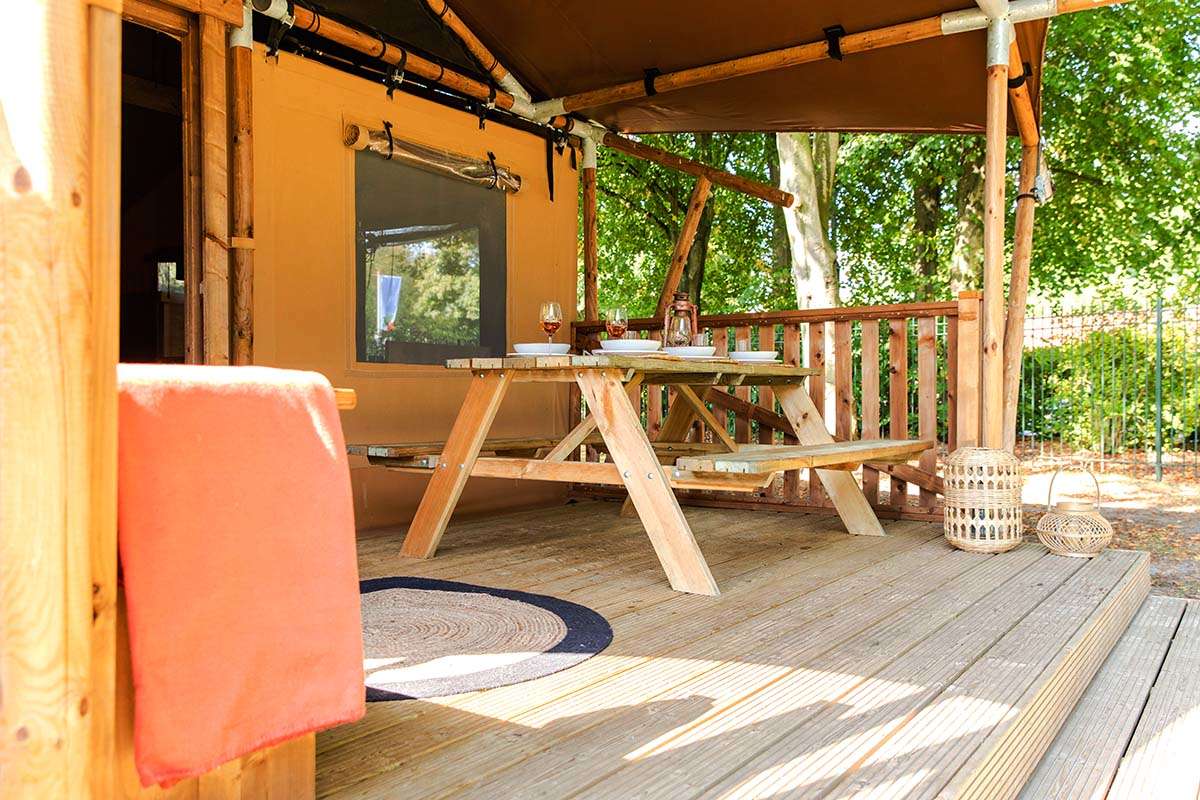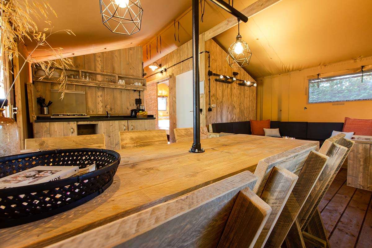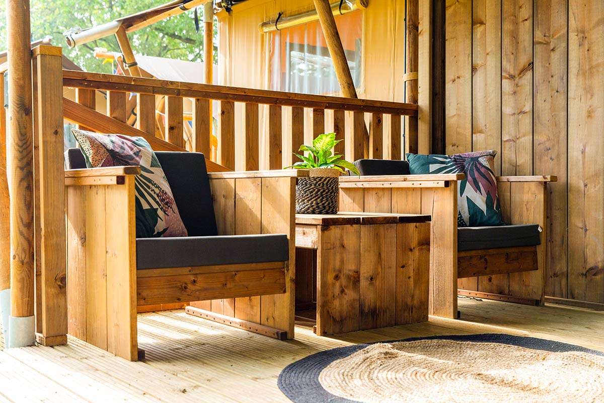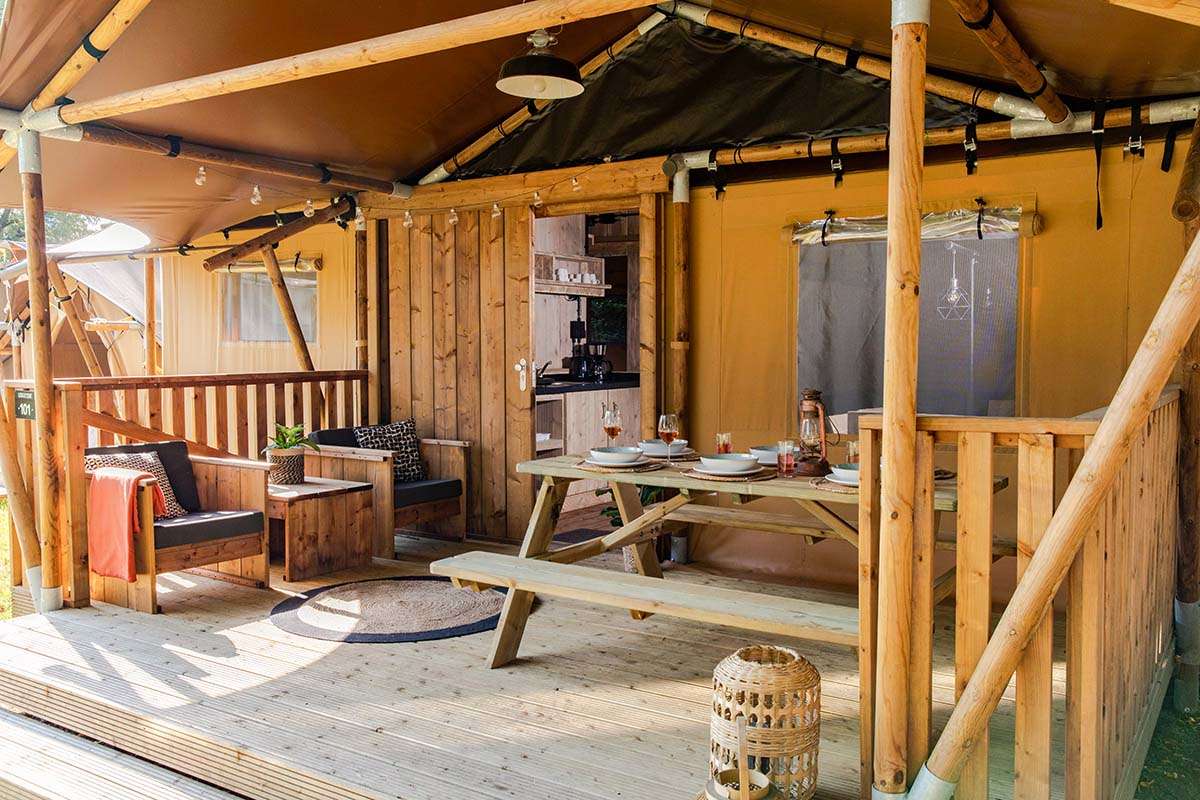 In unseren Luxus Lodgezelten für 5 Personen ist ein komfortabler Camping-Urlaub garantiert. Die Zelte bieten Ihnen sämtliche Vorzüge, die Sie sich für Ihren Urlaub wünschen können. Dank den Holz-Möbeln und der überdachten Terrasse können Sie die Natur voll und ganz genießen.