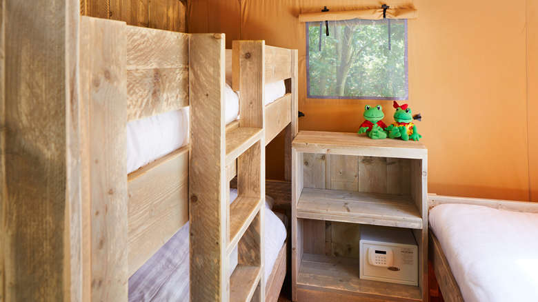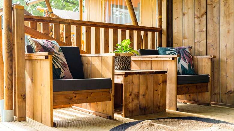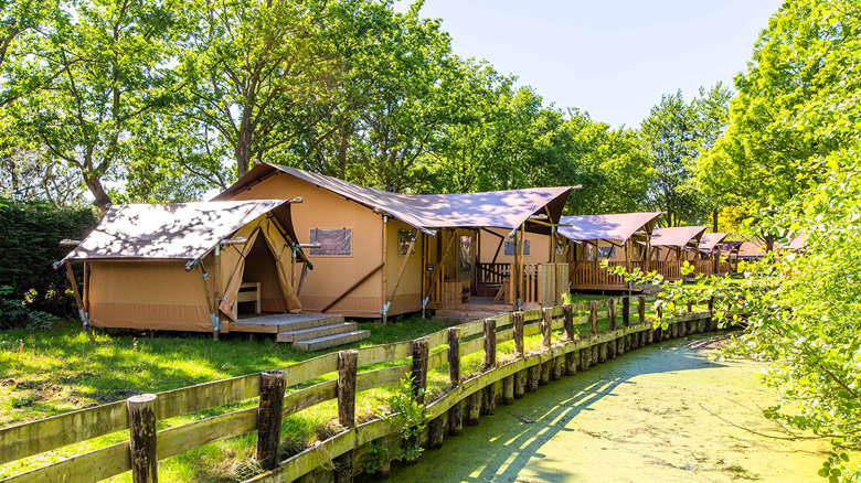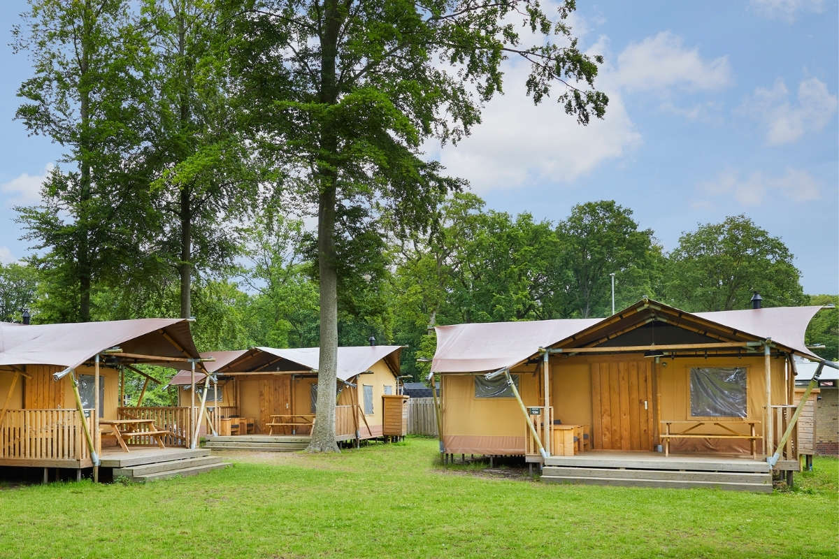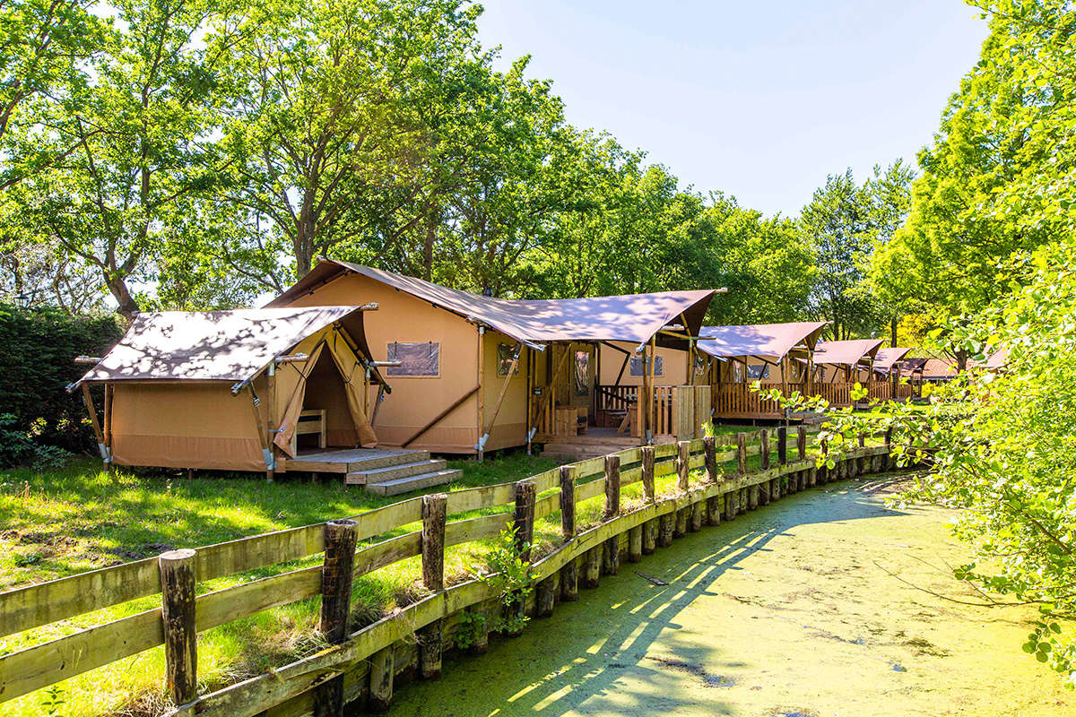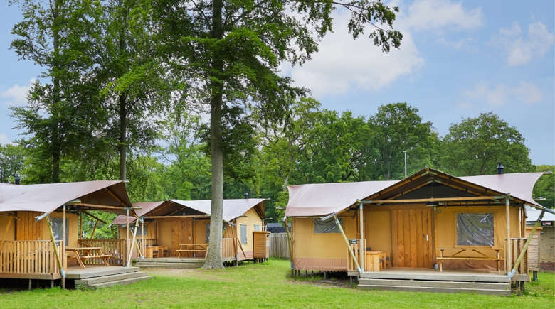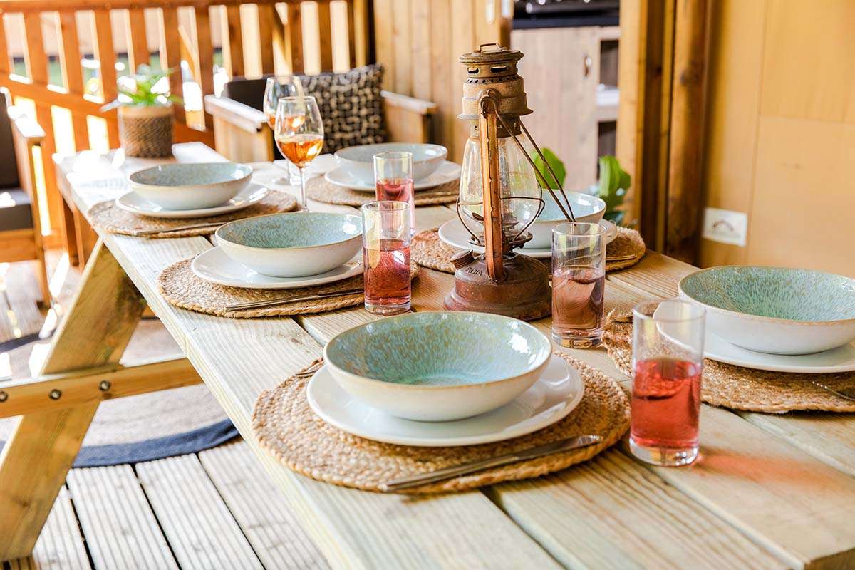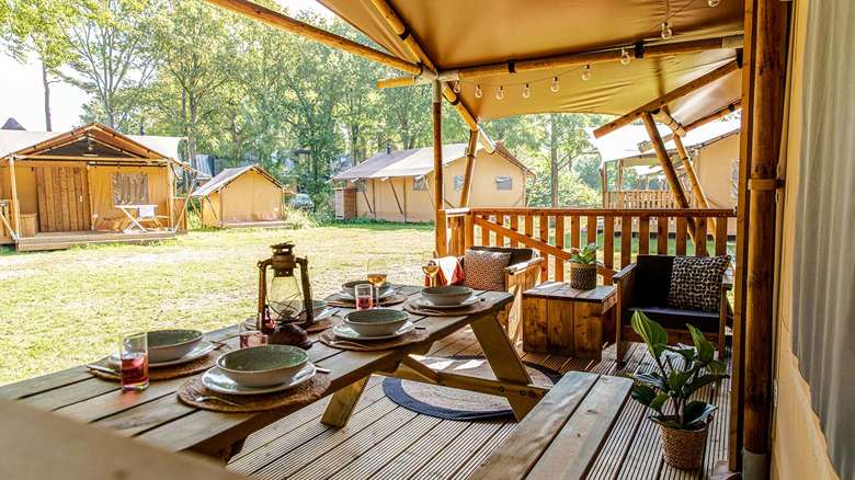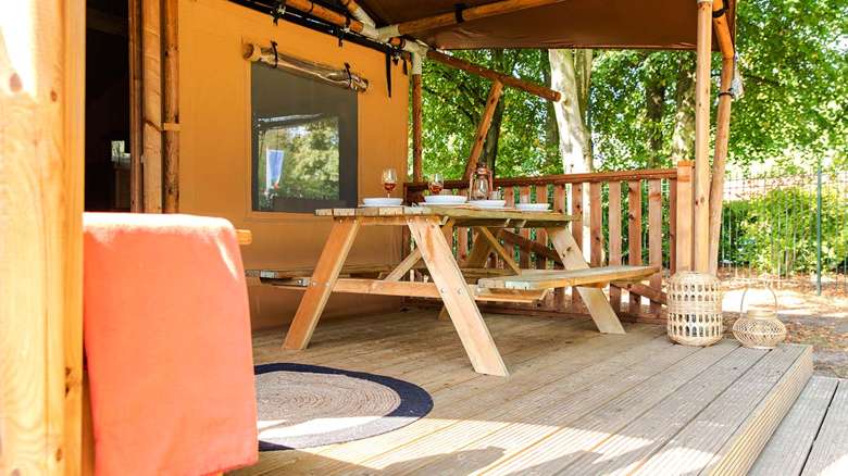 In unseren Luxus Lodgezelten für 5 Personen ist ein komfortabler Camping-Urlaub garantiert. Die Zelte bieten Ihnen sämtliche Vorzüge, die Sie sich für Ihren Urlaub wünschen können. Dank den Holz-Möbeln und der überdachten Terrasse können Sie die Natur voll und ganz genießen.