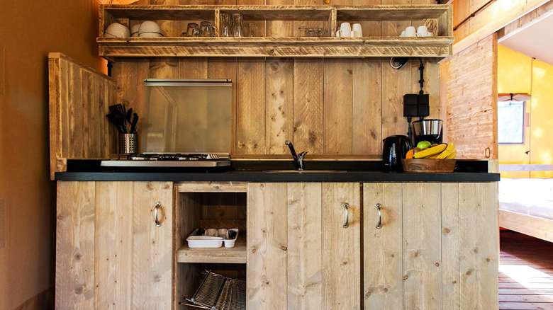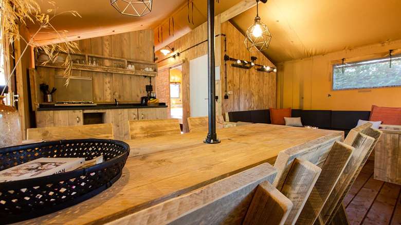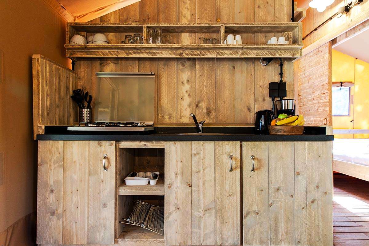 Die Lodgezelte sind mit einer Küche mit Kühlschrank, einem Gefrierfach und einem Kaffeeautomaten ausgestattet. Es gibt außerdem einen bequemen Sitz- und Essbereich. Die Lodgezelte haben eine separate Toilette mit Waschbecken.