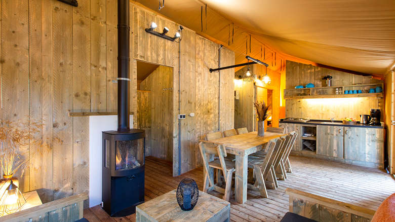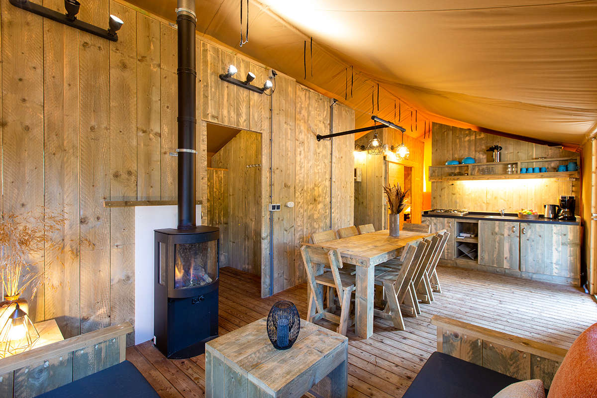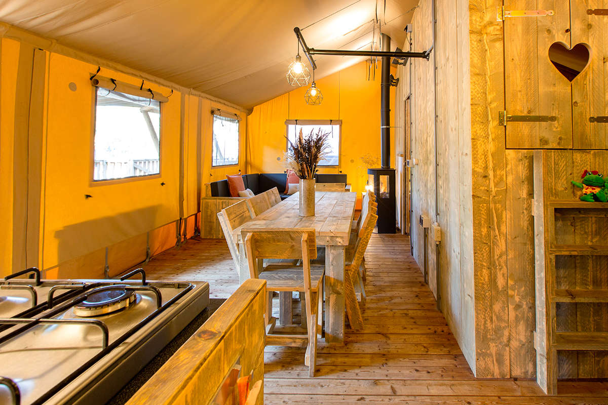 Das Luxus-Lodgezelt für 8 Personen hat eine Küche mit Herd, Kühlschrank und Kombi-Mikrowelle. Der Sitz- und Essbereich besteht aus Holz und bietet Ihnen einen bequemen Ort zum Essen und Entspannen.