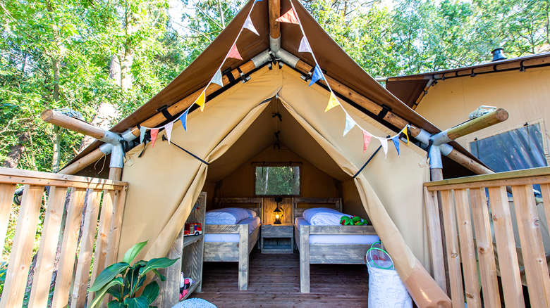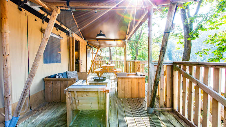Scheint die Sonne, dann können Sie die Vorderseite des Zelts öffnen, um die Veranda mit dem Lodgezelt zu verbinden und Ihren luxuriösen Camping-Urlaub so auf noch mehr Platz genießen.
