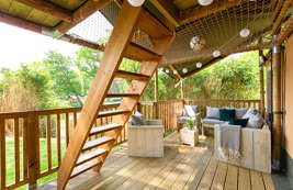Die Ranger Lodge verfügt über eine besonders große überdachte Terrasse mit Lounge Set, die durch die Umzäunung ein gemütliches und wohliges Gefühl vermittelt. Vor der Terrasse befindet sich ein Picknicktisch, an dem man das Leben im Freien bis in die letzten Stunden genießen kann.