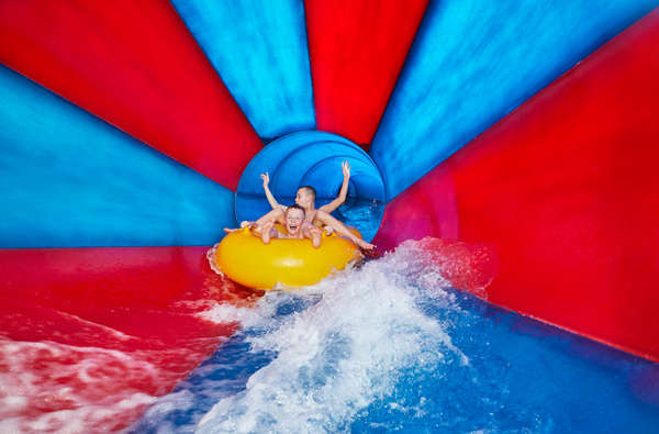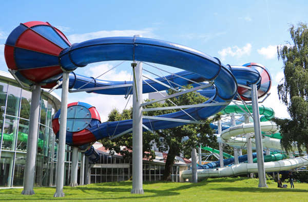 Die neue, sensationelle Wasserrutsche im Tikibad hat einen dreifachen Cone (Trichter) und eine Länge von 163 Metern. Aus beinahe 20 Metern Höhe sausen die Besucher auf einem Zwei-Personen-Raft mit vollem Tempo in den sogenannten Cone (Trichter) hinein.