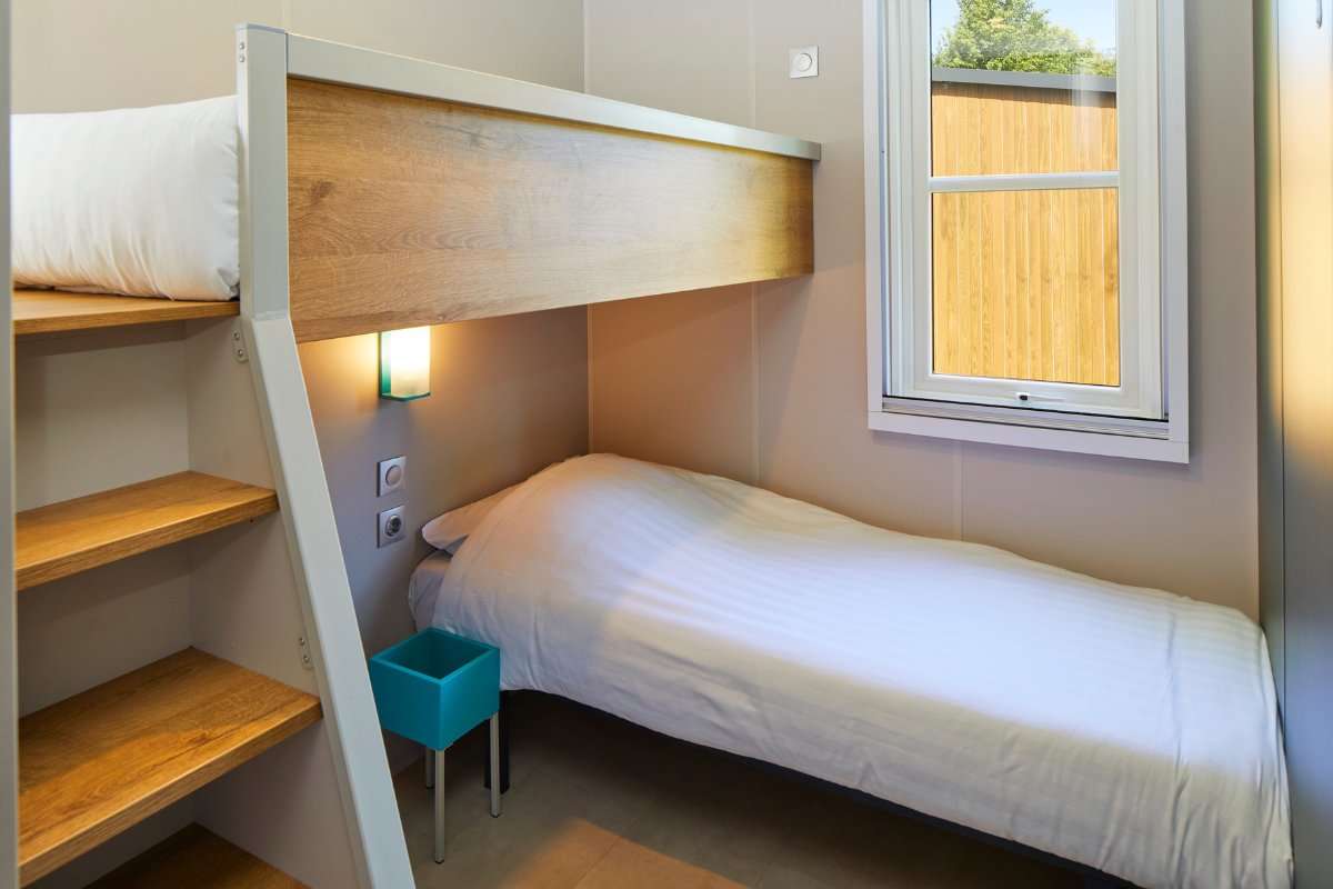 Der Duingalow bietet Platz für sechs Personen und verfügt über drei Schlafzimmer: ein Schlafzimmer mit Doppelbett, ein Schlafzimmer mit zwei separaten Einzelbetten und ein Kinder-Schlafzimmer mit Hochbett und einem separaten Einzelbett.