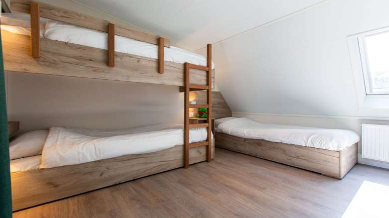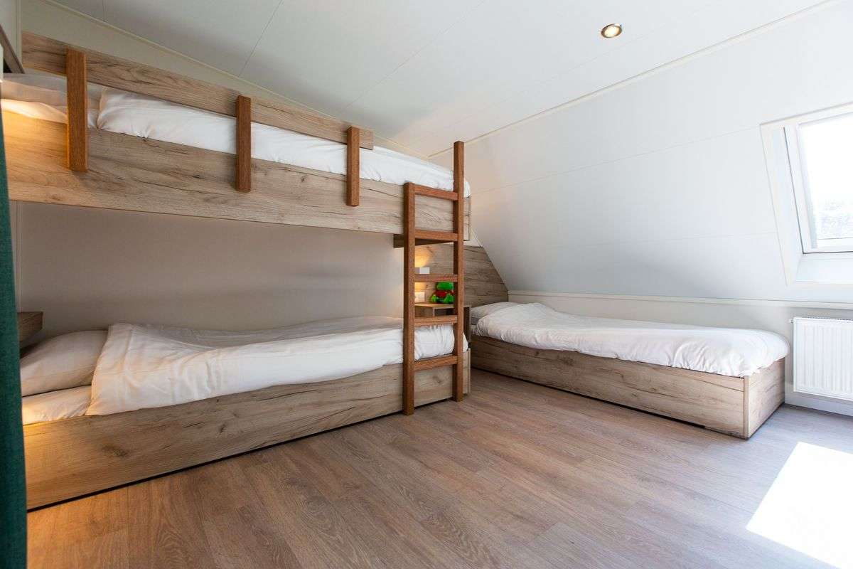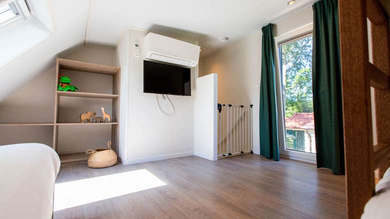 Die Treppe führt zum Schlafboden mit Platz für drei Kinder. Hier finden Sie ein Etagenbett und ein Einzelbett, einen Fernseher, eine Klimaanlage und einen Kleiderschrank.