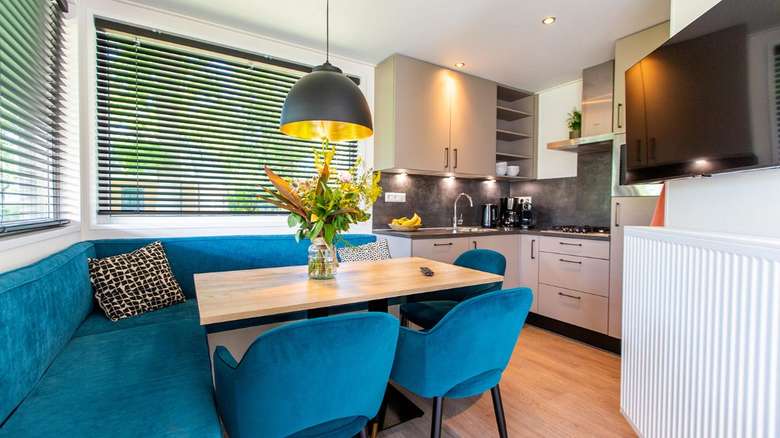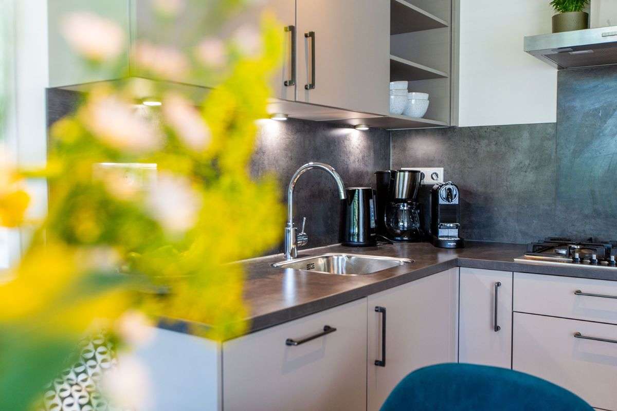 Dieses luxuriöse und kompakte Duingalow bietet Platz für 2 Erwachsene und 3 Kinder. Das Erdgeschoss besteht aus einer gemütlichen Wohnküche mit einer schick eingerichteten Sitzecke. Die Küche ist luxuriös ausgestattet mit Geschirrspüler, Nespresso-Kaffeemaschine, Wasserkocher, Gasherd, Kombimikrowelle und Kühlschrank mit Gefrierfach.