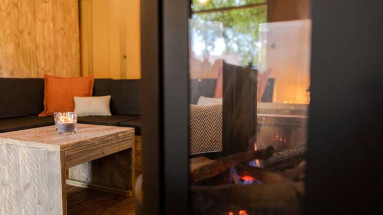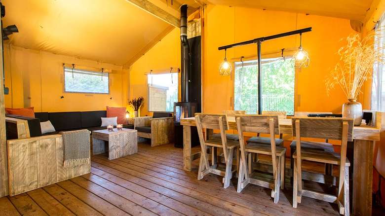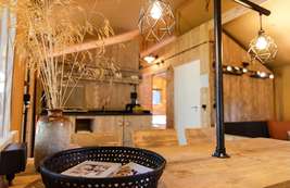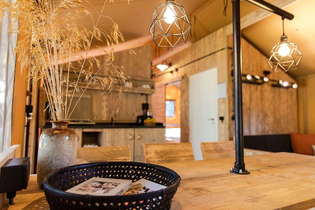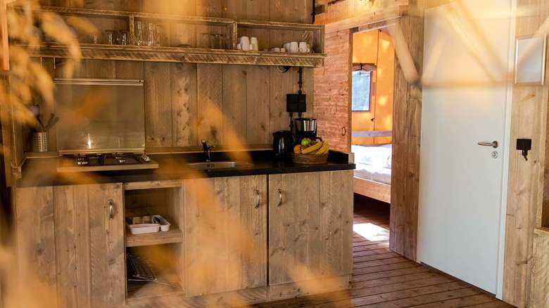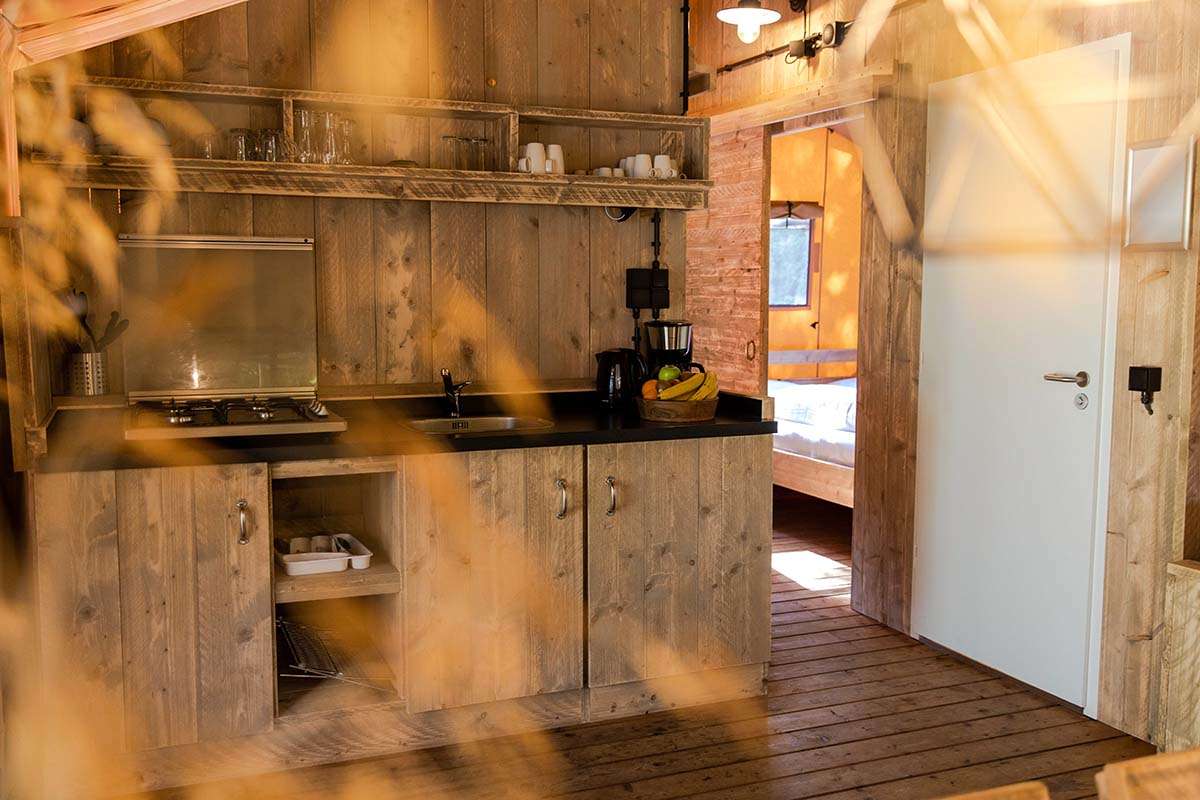 Das Luxus-Lodgezelt für 6 Personen hat eine Küche mit Herd, Kühlschrank und Kombi-Mikrowelle. Der Sitz- und Essbereich besteht aus Holz und bietet Ihnen einen bequemen Ort zum Essen und Entspannen.