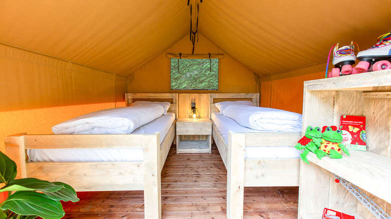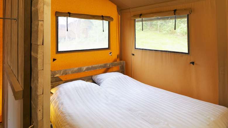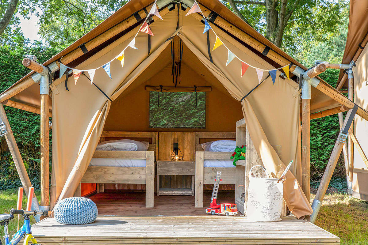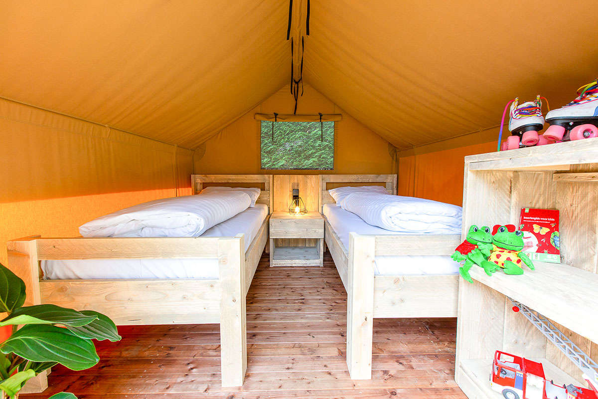 Es gibt außerdem drei Schlafzimmer: Ein Schlafzimmer für 2 Personen mit Doppelbett, ein Schlafzimmer für drei Erwachsene mit einem Etagenbett und ein Zwei-Personen-Lodge-Zelt mit zwei Betten. Die Betten sind mit luxuriösen Matratzen ausgestattet. Ein eventuelles Babybett kann nicht in die Schlafzimmer gestellt werden.