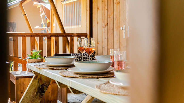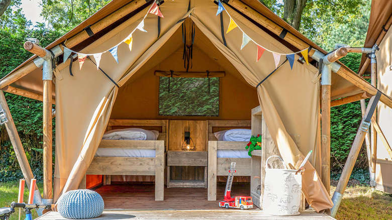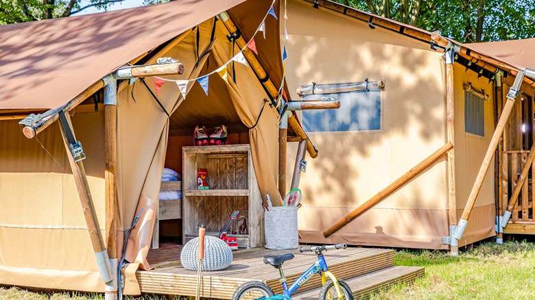 Scheint die Sonne, dann können Sie die Vorderseite des Zelts öffnen, um die Veranda mit dem Lodgezelt zu verbinden und Ihren luxuriösen Camping-Urlaub so auf noch mehr Platz genießen.