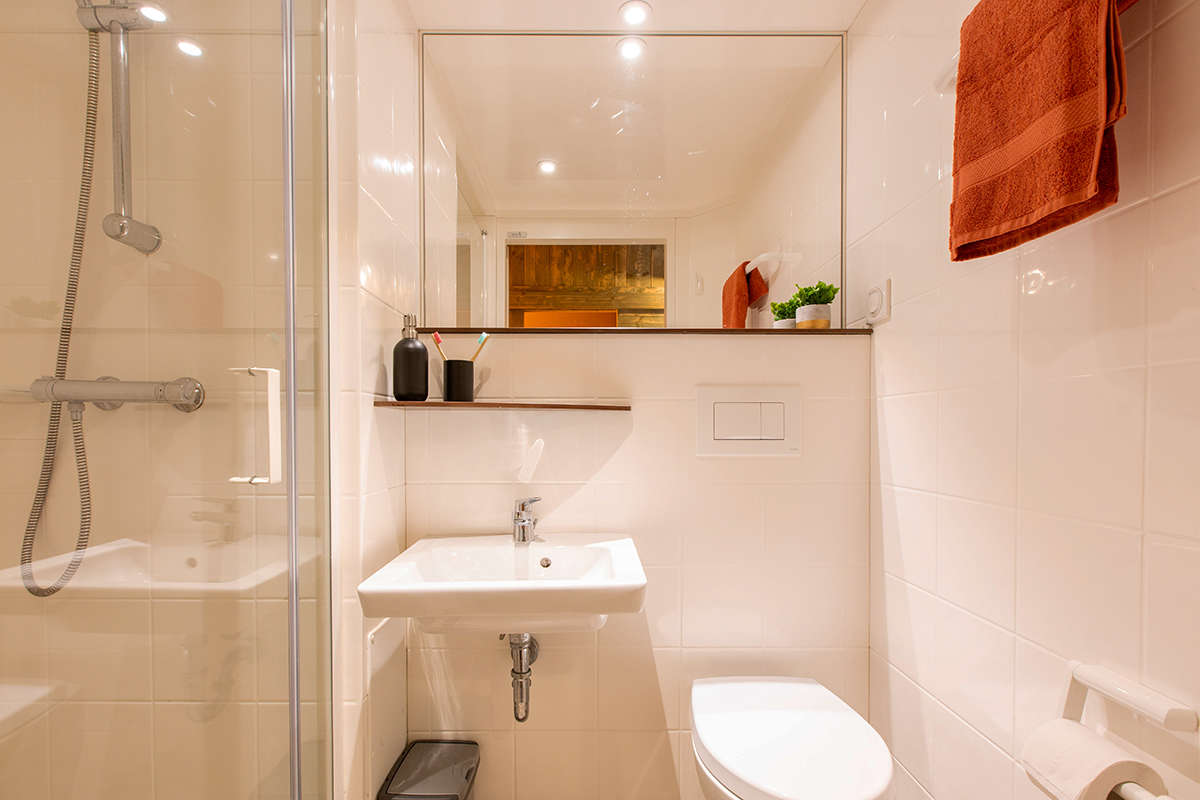 Es gibt außerdem drei Schlafzimmer: Ein Schlafzimmer für 2 Personen mit Doppelbett, ein Schlafzimmer für drei Erwachsene mit einem Etagenbett und ein separates Einzelbett. Sie finden hier außerdem eine süße Bettbox für einen Erwachsenen oder zwei Kinder. Die Betten sind mit luxuriösen Matratzen ausgestattet. Ein eventuelles Babybett kann nicht in die Schlafzimmer gestellt werden.