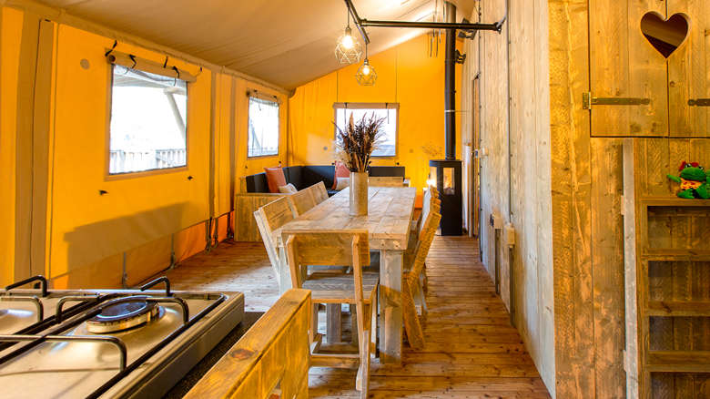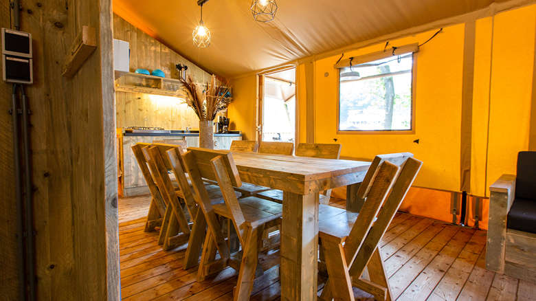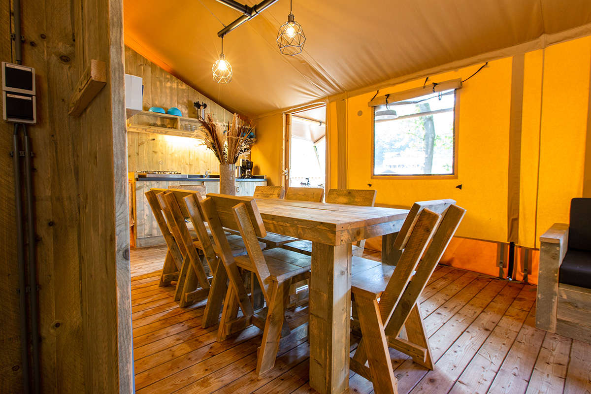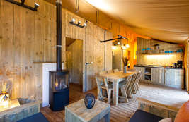 Das Luxus-Lodgezelt für 8 Personen hat eine Küche mit Herd, Kühlschrank und Kombi-Mikrowelle. Der Sitz- und Essbereich besteht aus Holz und bietet Ihnen einen bequemen Ort zum Essen und Entspannen.