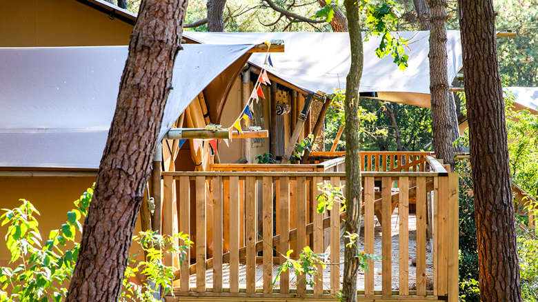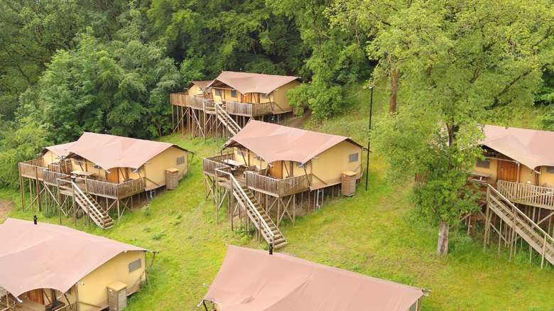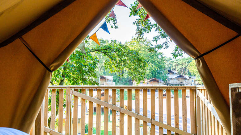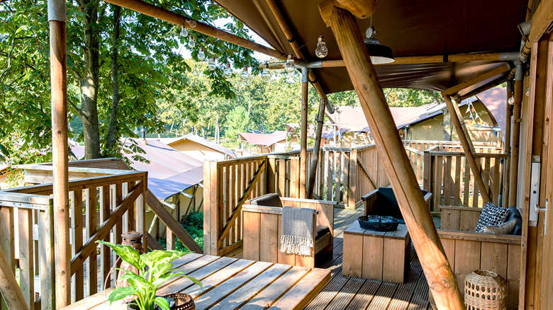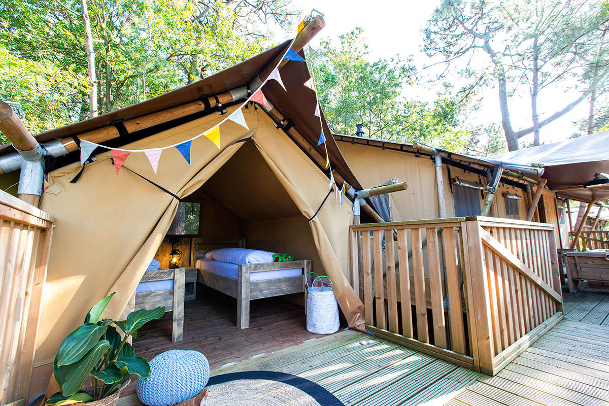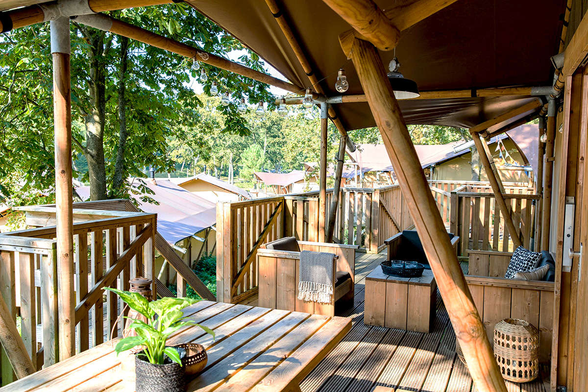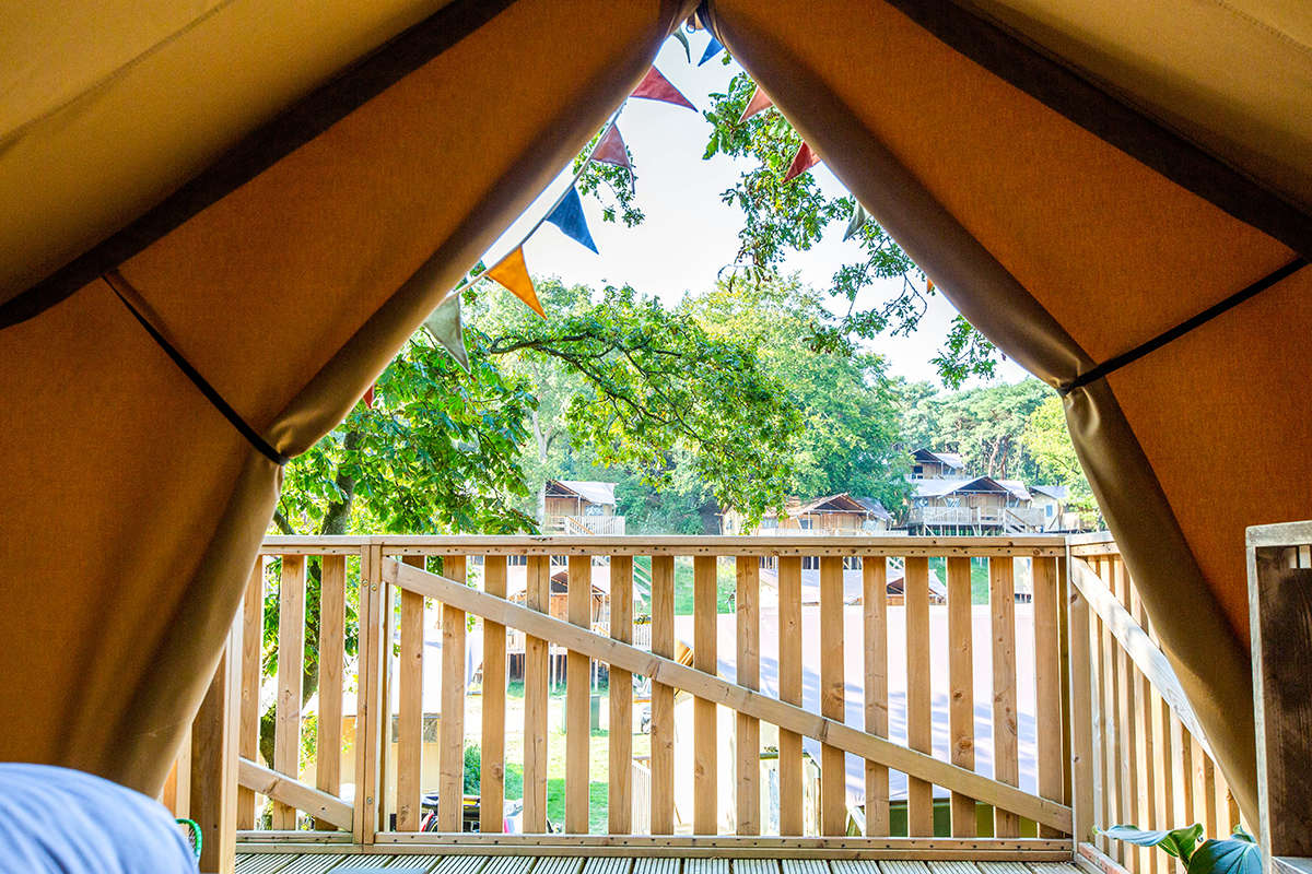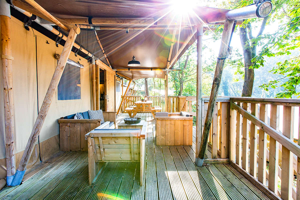 Scheint die Sonne, dann können Sie die Vorderseite des Zelts öffnen, um die Veranda mit dem Lodgezelt zu verbinden und Ihren luxuriösen Camping-Urlaub so auf noch mehr Platz genießen.
