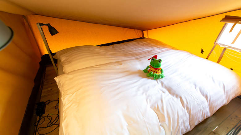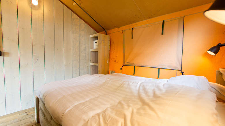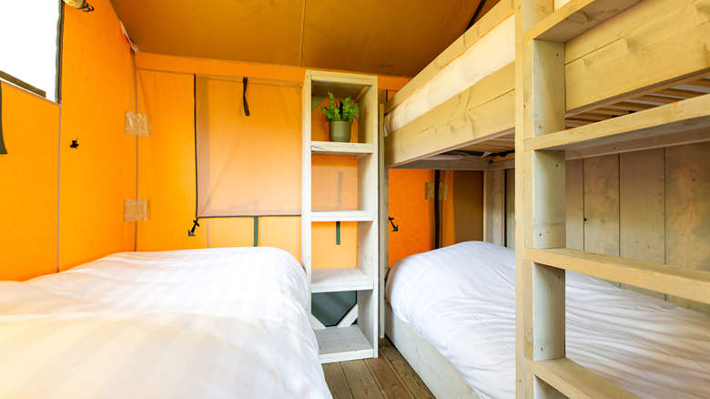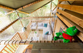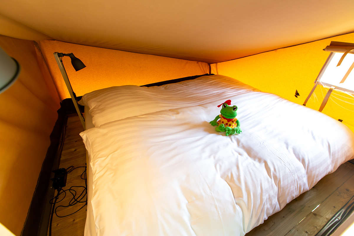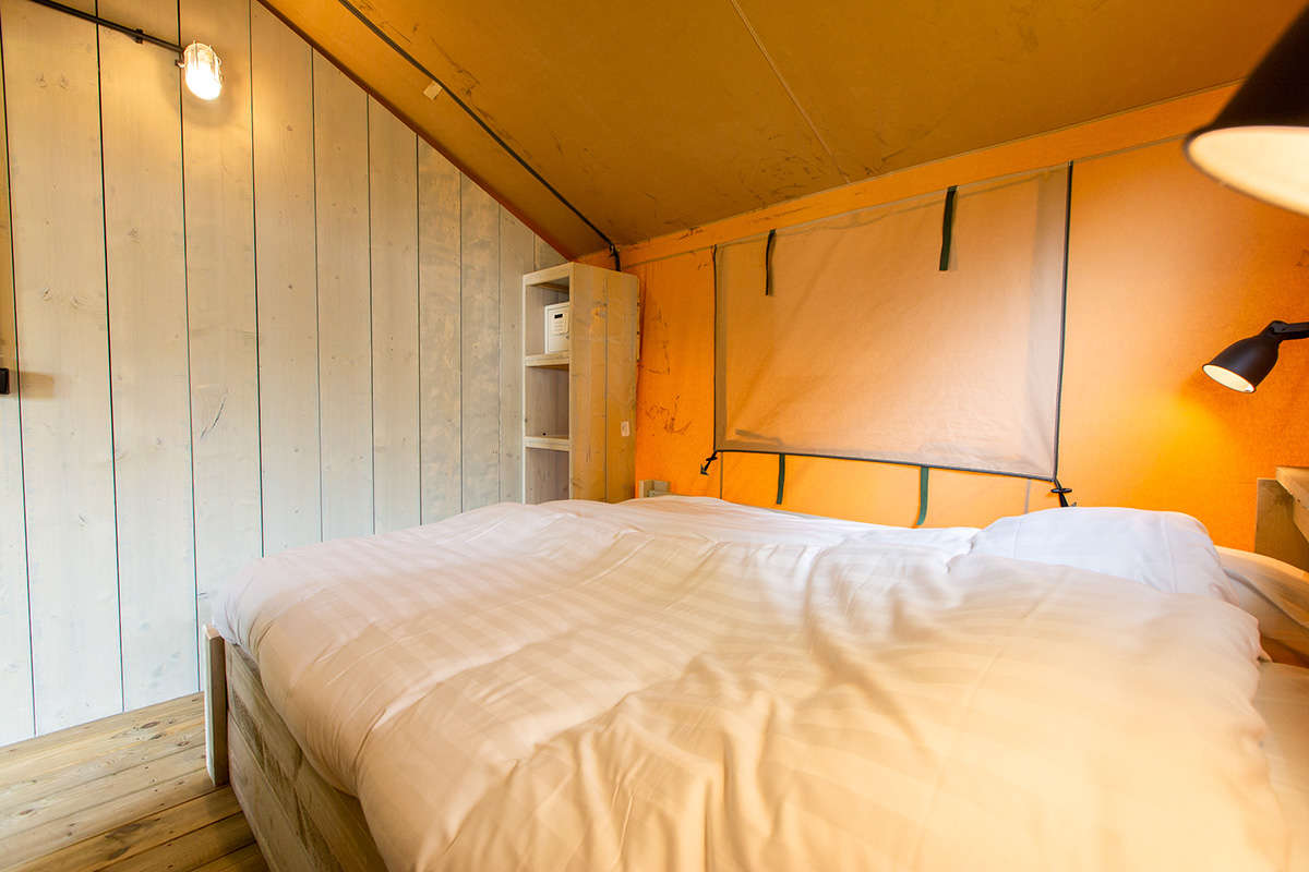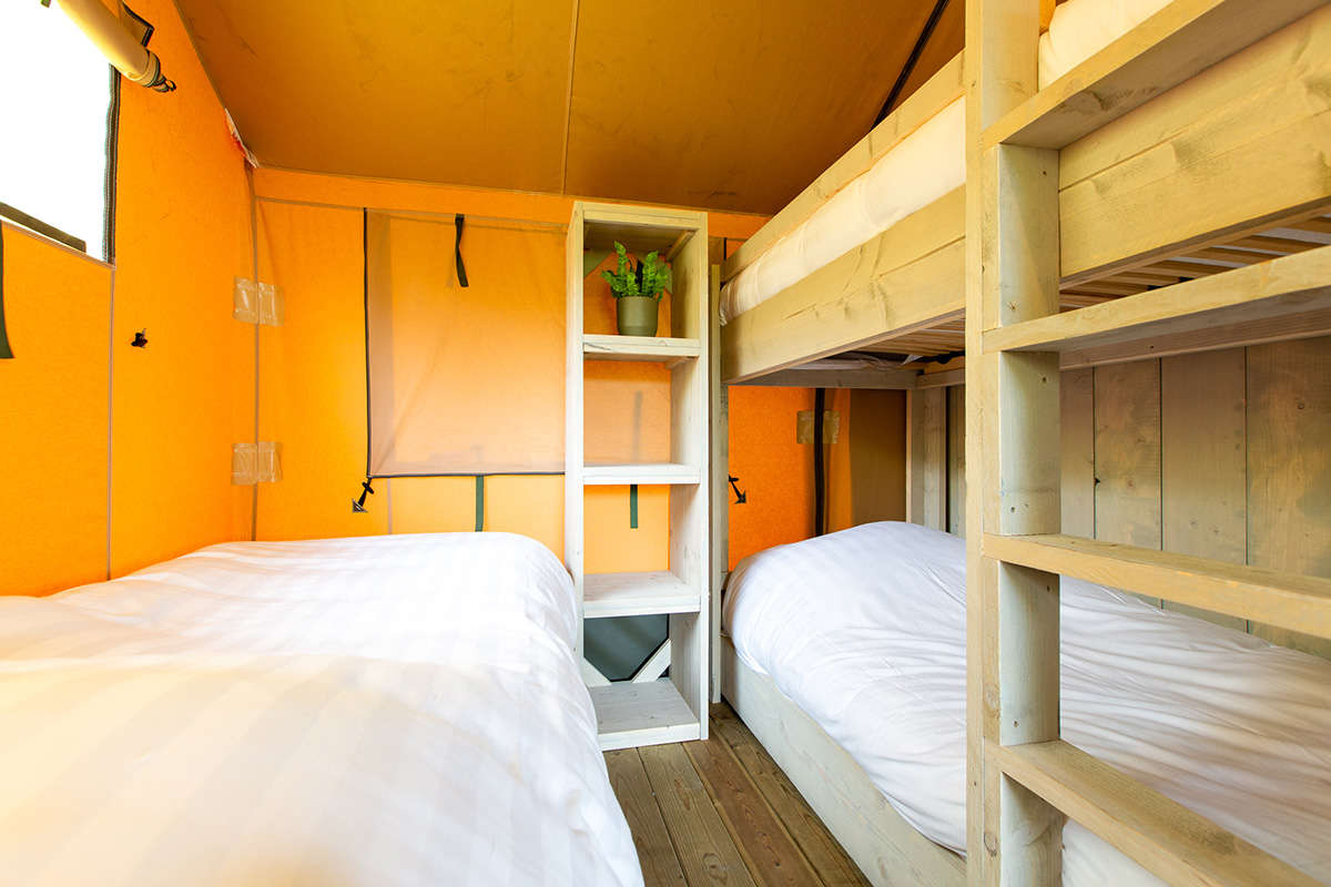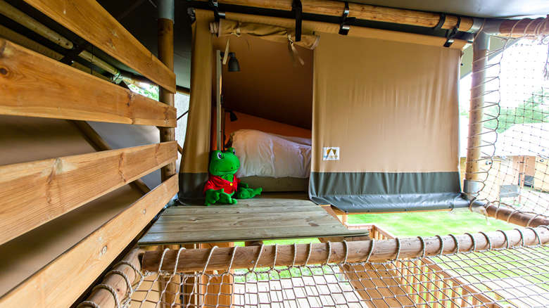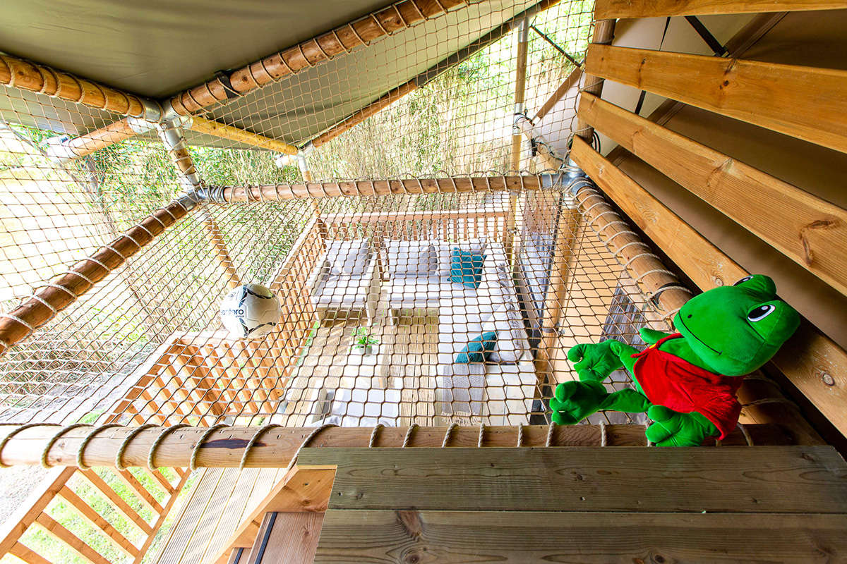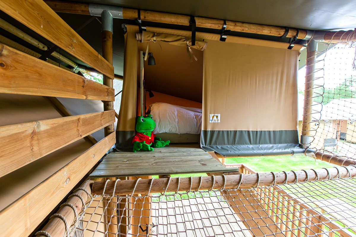 Das Lodgezelt hat drei Schlafzimmer. Zwei Schlafzimmer befinden sich im Erdgeschoss: ein Schlafzimmer mit einem Doppelbett und ein Schlafzimmer mit einem Einzelbett und einem Etagenbett. Das Besondere an dieser Range Lodge ist das zusätzliche Doppelzelt im Zeltdach mit einem daneben hängenden Spielnetz. Das ist ein besonderer Spaß für die Kinder, die sich fühlen, als würden sie in einem Baumhaus schlafen. Alle sind mit luxuriösen Matratzen ausgestattet. Ein eventuelles Babybett kann nicht in die Schlafzimmer gestellt werden.