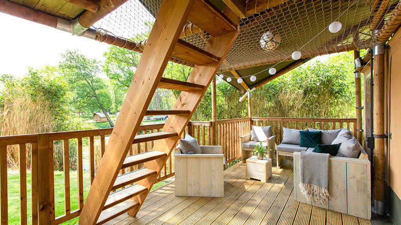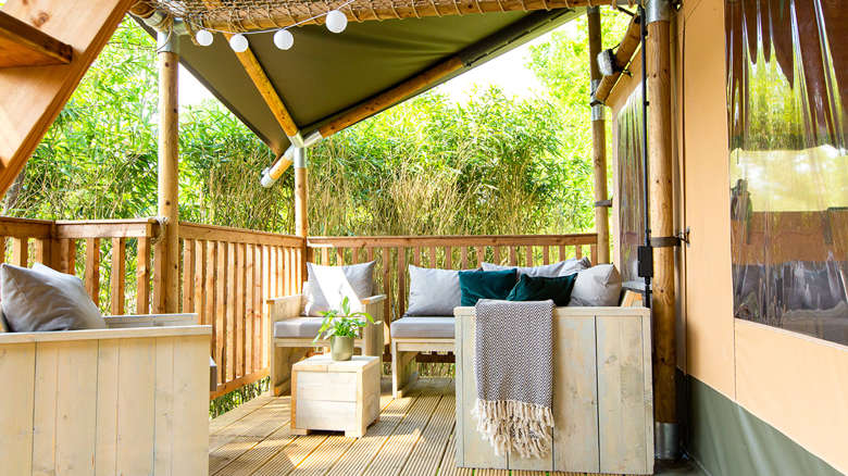 Die Ranger Lodge verfügt über eine besonders große überdachte Terrasse mit Lounge Set, die durch die Umzäunung ein gemütliches und wohliges Gefühl vermittelt. Vor der Terrasse befindet sich ein Picknicktisch, an dem man das Leben im Freien bis in die letzten Stunden genießen kann.