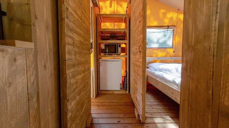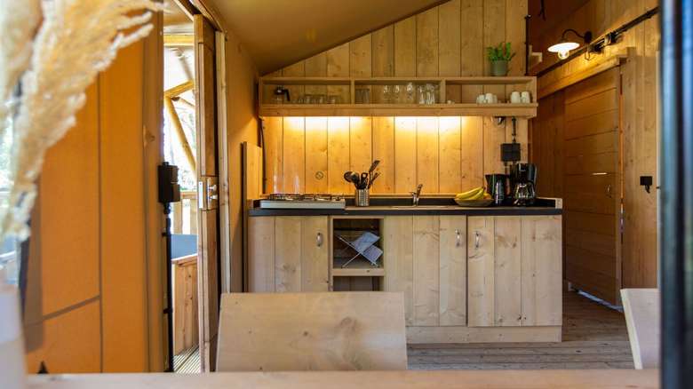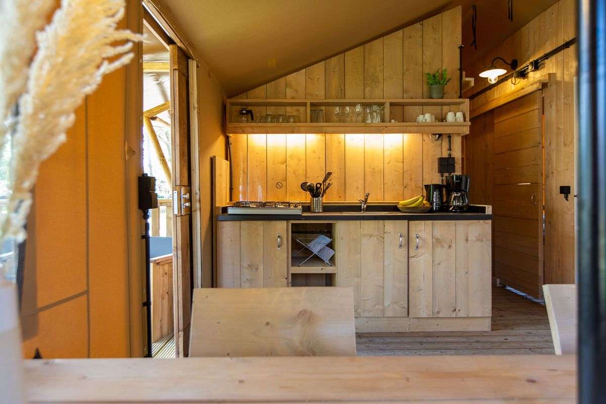 Die Luxe Lodgezelte für 5 Personen haben eine voll ausgestattet Küche mit unter anderem Kühlschrank, Gefrierschrank und Kaffeemaschine. Es gibt eine Sitz- und Essecke, wo man gemütlich zusammensitzen kann. Das Lodgezelt hat auch ein eigenes Badezimmer mit Dusche, Waschbecken und Toilette.