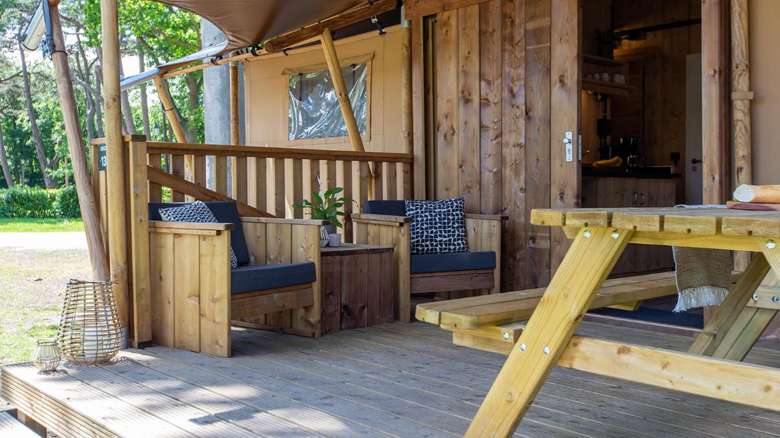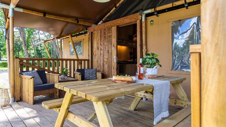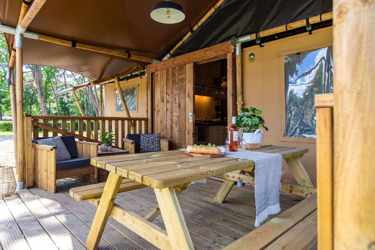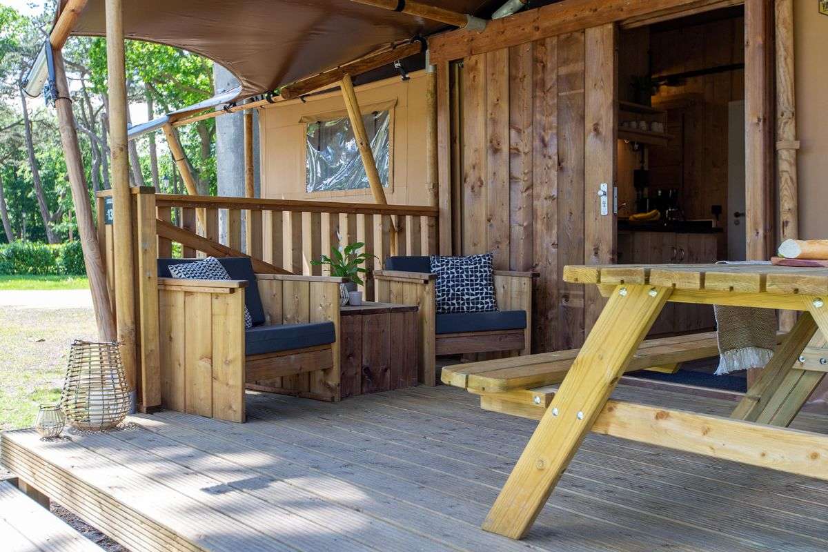 Die Lodgezelte haben eine Holzveranda mit einer Vordach. Auf den Lounge Sesseln oder der Picknickbank können Sie das schöne Leben im Freien genießen. Dieses Thermozelt hat auch ein gemütliches, atmosphärisches Haar.